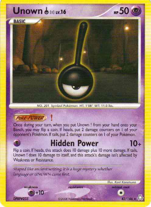 [P] Hidden Power (10+) Flip a coin. If heads, this attack does 10 damage plus 10 more damage. If tails, Unown ! does 10 damage to itself, and this attack's damage isn't affected by Weakness or Resistance.