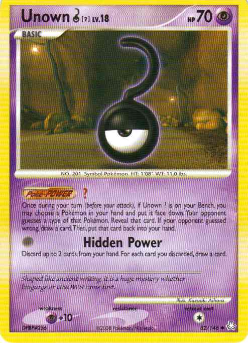 Type | Psychic | Pokemon serie | Legends Awakened | Stadie | Basic | HP | 70.0 | Sjældenhed | Uncommon | Tilbagetrækning | 1.0 | Svaghed | P+10 | Kortnummer | 82 | Evne | [0] Hidden Power - Discard up to 2 cards from your hand. For each card you discarded, draw a card.