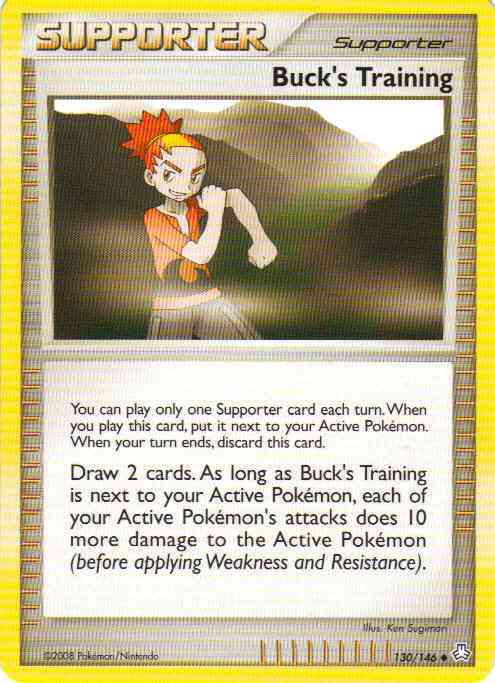 Draw 2 cards. As long as Buck's Training is next to your Active Pokemon, each of your Active Pokemon's attacks does 10 more damage to the Active Pokemon (before applying Weakness and Resistance).