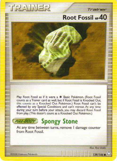 Play Root Fossil as if it were a Basic Pokemon. (Root Fossil counts as a Trainer card as well, but if Root Fossil is Knocked Out, this counts as a Knocked Out Pokemon.) Root Fossil can't be affected by any Special Conditions and can't retreat. At any time during your turn before your attack, you may discard Root Fossil from play. (This doesn't count as a Knocked Out Pokemon.)