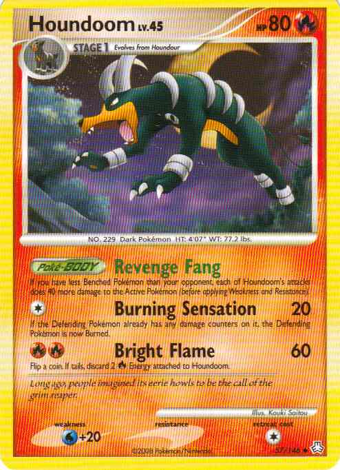 | Evne2 | [C] Burning Sensation (20) If the Defending Pokemon already has any damage counters on it, the Defending Pokemon is now Burned. [RR] Bright Flame (60) Flip a coin. If tails, discard 2 R Energy attached to Houndoom.