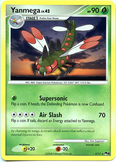 Type | Grass | Pokemon serie | OP Series 8 | Stadie | Stage 1 | HP | 90.0 | Sjældenhed | Rare | Tilbagetrækning | 0.0 | Modstand | F-20 | Svaghed | L+20 | Kortnummer | 5 | Evne | [G] Supersonic - Flip a coin. If heads, the Defending Pokemon is now Confused. [CCCC] Air Slash (70) Flip a coin. If tails, discard an Energy attached to Yanmega.