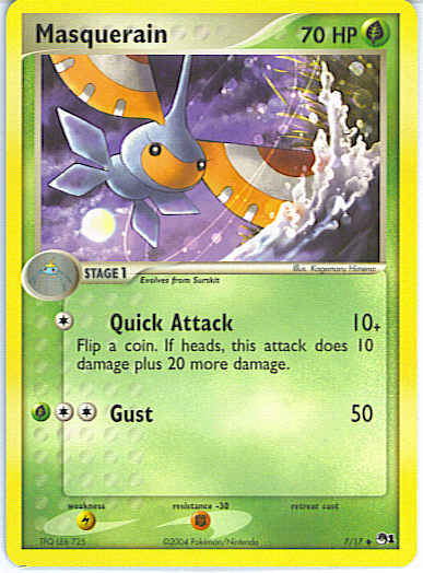Type | Grass | Pokemon serie | OP Series 1 | Stadie | Stage 1 | HP | 70 | Sjældenhed | Uncommon | Modstand | F | Svaghed | L | Kortnummer | 7 | Evne | [C] Quick Attack (10+) Flip a coin. If heads, this attack does 10 damage plus 20 more damage. [CCG] Gust (50)