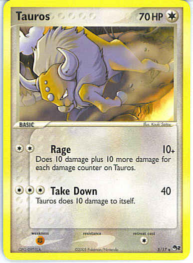 Type | Colorless | Pokemon serie | OP Series 2 | Stadie | Basic | HP | 70 | Sjældenhed | Rare | Tilbagetrækning | 1 | Svaghed | F | Kortnummer | 5 | Evne | [CC] Rage (10+) Does 10 damage plus 10 more damage for each damage counter on Tauros. [CCC] Take Down (40) Tauros does 10 damage to itself.