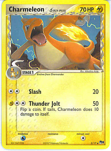 Type | Lightning | Pokemon serie | OP Series 5 | Stadie | Stage 1 | HP | 70 | Sjældenhed | Uncommon | Tilbagetrækning | 1 | Svaghed | W | Kortnummer | 5 | Evne | [CC] Slash (20) [CCL] Thunder Jolt (50) Flip a coin. If tails, Charmeleon does 10 damage to itself.