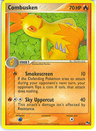 Type | Fire | Pokemon serie | OP Series 4 | Stadie | Stage 1 | HP | 70 | Sjældenhed | Uncommon | Tilbagetrækning | 1 | Svaghed | W | Kortnummer | 6 | Evne | [R] Smokescreen (10) If the Defending Pokemon tries to attack during your opponent's next turn, your opponent flips a coin. If tails, that attack does nothing. [CCR] Sky Uppercut (40) This attack's damage isn't affected by Resistance.