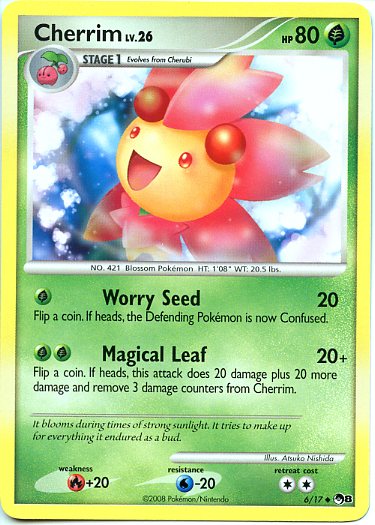 | Evne2 | [G] Worry Seed (20) Flip a coin. If heads, the Defending Pokemon is now Confused. [GG] Magical Leaf (20+) Flip a coin. If heads, this attack does 20 damage plus 20 more damage and remove 3 damage counters from Cherrim.