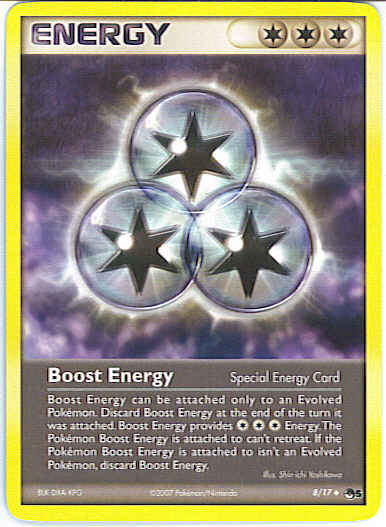 Boost Energy can be attached only to an Evolved Pokemon. Discard Boost Energy at the end of the turn it was attached. Boost Energy provides CCC Energy. The Pokemon Boost Energy is attached to can't retreat. If the Pokemon Boost Energy is attached to isn't an Evolved Pokemon, discard Boost Energy.