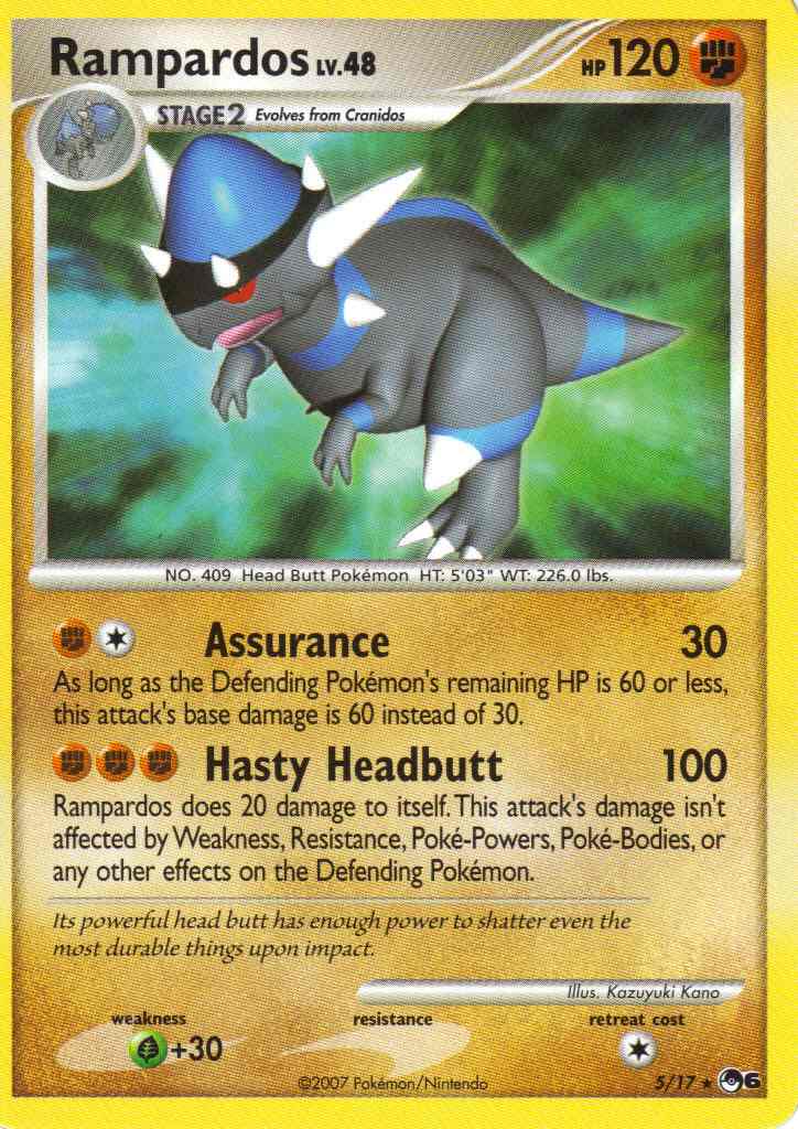 Type | Fighting | Pokemon serie | OP Series 6 | Stadie | Stage 2 | HP | 120 | Sjældenhed | Rare | Tilbagetrækning | 1 | Svaghed | G+30 | Kortnummer | 5 | Evne | [CF] Assurance (30) As long as the Defending Pokemon's remaining HP is 60 or less, this attack's base damage is 60 instead of 30. [FFF] Hasty Headbutt (100) Rampardos does 20 damage to itself. This attack's damage isn't affected by Weakness, Resistance, Poke-Powers, Poke-Bodies, or any other effects on the Defending Pokemon.