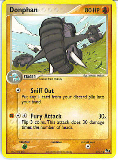 Type | Fighting | Pokemon serie | OP Series 3 | Stadie | Stage 1 | HP | 80 | Sjældenhed | Uncommon | Tilbagetrækning | 1 | Svaghed | G | Kortnummer | 8 | Evne | [C] Sniff Out - Put any 1 card from your discard pile into your hand. [CCF] Fury Attack (30x) Flip 3 coins. This attack does 30 damage times the number of heads.