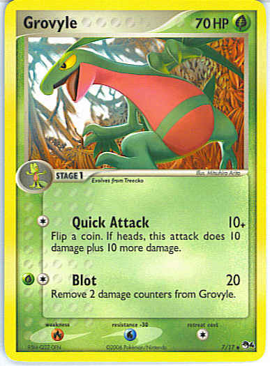 Type | Grass | Pokemon serie | OP Series 4 | Stadie | Stage 1 | HP | 70 | Sjældenhed | Uncommon | Tilbagetrækning | 1 | Modstand | W | Svaghed | R | Kortnummer | 7 | Evne | [C] Quick Attack (10+) Flip a coin. If heads, this attack does 10 damage plus 10 more damage. [CG] Blot (20) Remove 2 damage counters from Grovyle.