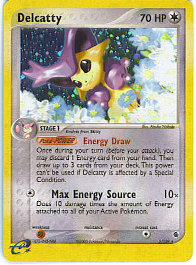 Type | Colorless | Pokemon serie | Ruby Sapphire | Stadie | Stage 1 | HP | 70 | Sjældenhed | Rare | Tilbagetrækning | 1 | Svaghed | F | Kortnummer | 5 | Evne | [C] Max Energy Source (10x) Does 10 damage times the number of Energy attached to all of your Active Pokemon.