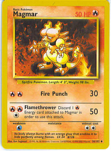 Type | Fire | Pokemon serie | Base | Stadie | Basic | HP | 50 | Sjældenhed | Uncommon | Tilbagetrækning | 2 | Svaghed | W | Kortnummer | 36 | Evne |