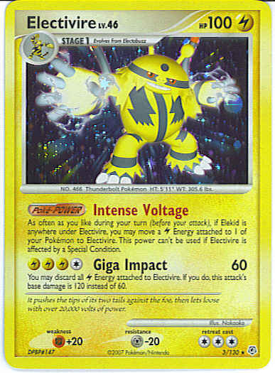 Type | Lightning | Pokemon serie | Diamond and Pearl | Stadie | Stage 1 | HP | 100 | Sjældenhed | Rare | Tilbagetrækning | 3 | Modstand | M-20 | Svaghed | F+20 | Kortnummer | 3 | Evne |