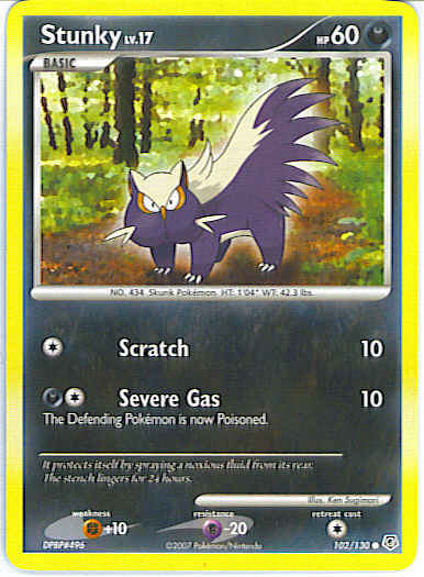 Type | Darkness | Pokemon serie | Diamond and Pearl | Stadie | Basic | HP | 60 | Sjældenhed | Common | Tilbagetrækning | 1 | Modstand | P-20 | Svaghed | F+10 | Kortnummer | 102 | Evne |