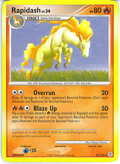 [CRR] Blaze Up (50) Flip a coin. If tails, discard a R Energy attached to Rapidash and this attack does 10 damage to each of your opponent's Benched Pokemon. (Don't apply Weakness and Resistance for Benched Pokemon.)