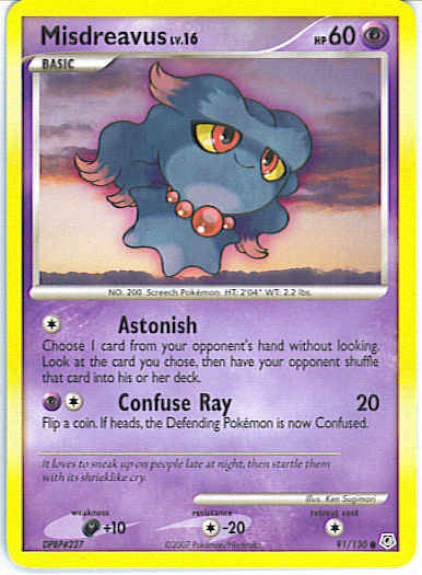 Type | Psychic | Pokemon serie | Diamond and Pearl | Stadie | Basic | HP | 60 | Sjældenhed | Common | Tilbagetrækning | 1 | Modstand | C-20 | Svaghed | D+10 | Kortnummer | 91 | Evne |