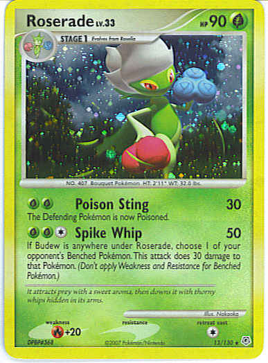 Type | Grass | Pokemon serie | Diamond and Pearl | Stadie | Stage 1 | HP | 90 | Sjældenhed | Rare | Tilbagetrækning | 1 | Svaghed | R+20 | Kortnummer | 13 | Evne |