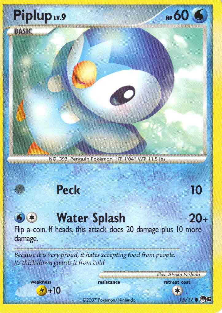 Type | Water | Pokemon serie | OP Series 6 | Stadie | Basic | HP | 60 | Sjældenhed | Common | Tilbagetrækning | 1 | Svaghed | L+10 | Kortnummer | 15 | Evne | [0] Peck (10) [CW] Water Splash (20+) Flip a coin. If heads, this attack does 20 damage plus 10 more damage.