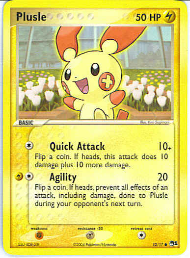 Type | Lightning | Pokemon serie | OP Series 1 | Stadie | Basic | HP | 50 | Sjældenhed | Common | Tilbagetrækning | 1 | Modstand | M | Svaghed | F | Kortnummer | 13 | Evne | [C] Quick Attack (10+) Flip a coin. If heads, this attack does 10 damage plus 10 more damage. [CL] Agility (20) Flip a coin. If heads, prevent all effects of an attack, including damage, done to Plusle during your opponent's next turn.