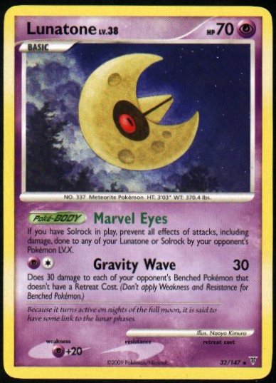 Type | Psychic | Pokemon serie | Supreme Victors | Stadie | Basic | HP | 70 | Sjældenhed | Rare | Svaghed | P+20 | Kortnummer | 32 | Evne | of attacks, including damage done to any of your Lunatone or Solrock by your opponent's Pokemon LV.X (Poke-BODY)