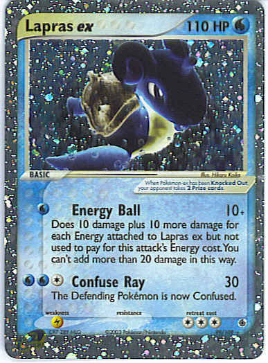 Type | Water | Pokemon serie | Ruby Sapphire | Stadie | Basic | HP | 110 | Sjældenhed | Ultra-Rare | Tilbagetrækning | 3 | Svaghed | L | Kortnummer | 99 | Evne | [W] Energy Ball (10+) Does 10 damage plus 10 more damage for each Energy attached to Lapras ex but not used to pay for this attack's Energy cost. You can't add more then 20 damage in this way. [CWW] Confuse Ray (30) The Defending Pokemon is now Confused.