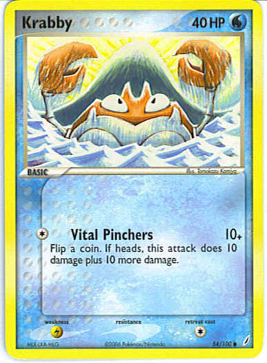 Type | Water | Pokemon serie | Crystal Guardians | Stadie | Basic | HP | 40 | Sjældenhed | Common | Tilbagetrækning | 1 | Svaghed | L | Kortnummer | 54 | Evne | [C] Vital Pinchers (10+) Flip a coin. If heads, this attack does 10 damage plus 10 more damage. | Evne2 | [C] Vital Pinchers (10+) Flip a coin. If heads, this attack does 10 damage plus 10 more damage. | Kunstner | Tomokazu Komiya |