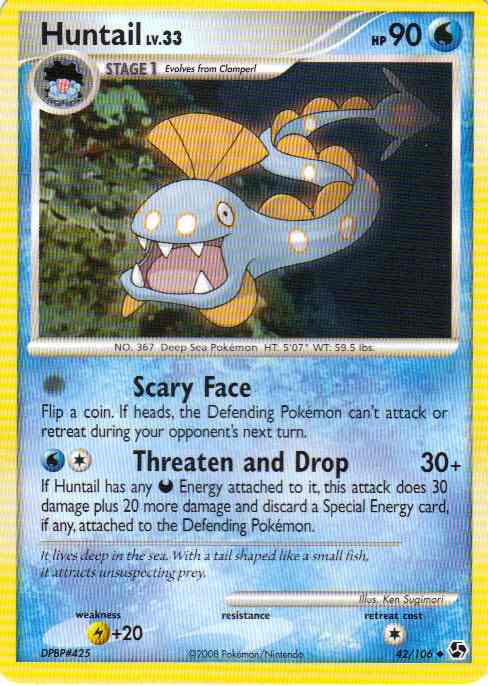 Type | Water | Pokemon serie | Great Encounters | Stadie | Stage 1 | HP | 90.0 | Sjældenhed | Uncommon | Tilbagetrækning | 1.0 | Svaghed | L+20 | Kortnummer | 42 | Evne | [0] Scary Face - Flip a coin. If heads, the Defending Pokemon can't attack or retreat during your opponent's next turn. [CW] Threaten and Drop (30+) If Huntail has any D Energy attached to it, this attack does 30 damage plus 20 more damage and discard a Special Energy card, if any, attached to the Defending Pokemon.