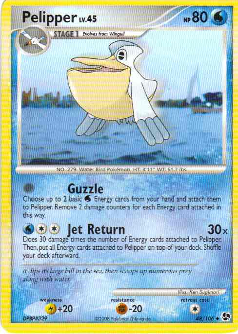 Type | Water | Pokemon serie | Great Encounters | Stadie | Stage 1 | HP | 80.0 | Sjældenhed | Uncommon | Tilbagetrækning | 1.0 | Modstand | F-20 | Svaghed | L+20 | Kortnummer | 48 | Evne | [0] Guzzle - Choose up to 2 basic W Energy cards from your hand and attach them to Pelipper. Remove 2 damage counters for each Energy card attached in this way. [CCW] Jet Return (30x) Does 30 damage times the number of Energy cards attached to Pelipper. Then, put all Energy cards attached to Pelipper on top of your deck. Shuffle your deck afterward.