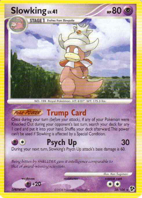 Type | Psychic | Pokemon serie | Great Encounters | Stadie | Stage 1 | HP | 80.0 | Sjældenhed | Rare | Tilbagetrækning | 2.0 | Svaghed | P+20 | Kortnummer | 28 | Evne | [CP] Psych Up (30) During your next turn, Slowking's Psych Up attack's base damage is 60.