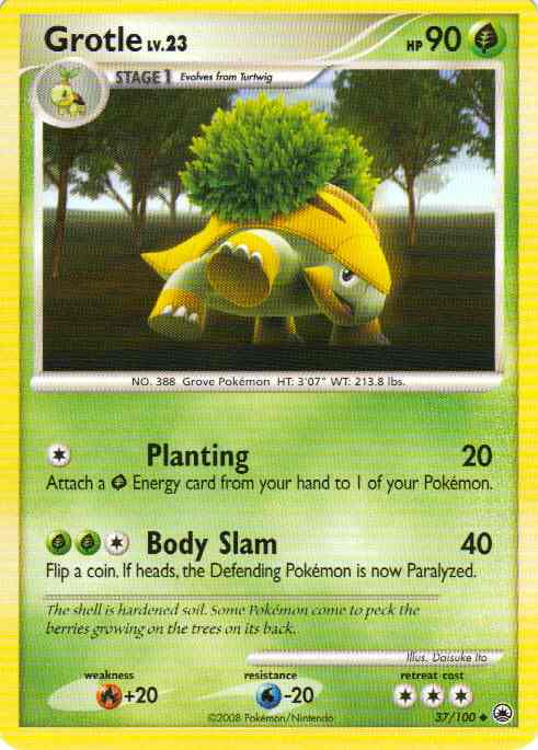 Type | Grass | Pokemon serie | Majestic Dawn | Stadie | Stage 1 | HP | 90.0 | Sjældenhed | Uncommon | Tilbagetrækning | 3.0 | Modstand | W-20 | Svaghed | R+20 | Kortnummer | 37 | Evne | [C] Planting (20) Attach a G Energy card from your hand to 1 of your Pokemon. [CGG] Body Slam (40) Flip a coin. If heads, the Defending Pokemon is now Paralyzed.