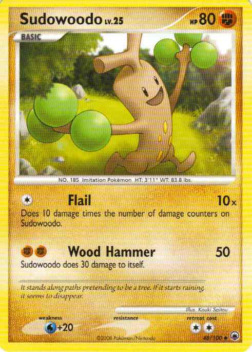 Type | Fighting | Pokemon serie | Majestic Dawn | Stadie | Basic | HP | 80.0 | Sjældenhed | Uncommon | Tilbagetrækning | 2.0 | Svaghed | W+20 | Kortnummer | 48 | Evne | [C] Flail (10x) Does 10 damage times the number of damage counters on Sudowoodo. [FF] Wood Hammer (50) Sudowoodo does 30 damage to itself.