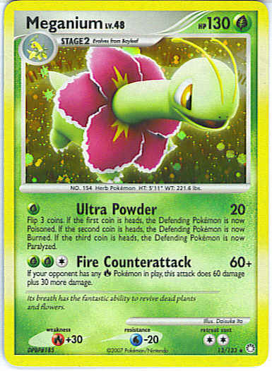 [G] Ultra Powder (20) Flip 3 coins. If the first coin is heads, the Defending Pokemon is now Poisoned. If the second coin is heads, the Defending Pokemon is now Burned. If the third coin is heads, the Defending Pokemon is now Paralyzed.