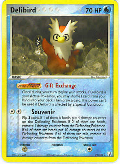 Type | Water | Pokemon serie | Team Rocket Returns | Stadie | Basic | HP | 70 | Sjældenhed | Rare | Tilbagetrækning | 1 | Svaghed | M | Kortnummer | 21 | Evne | [CC] Souvenir - Flip 3 coins. If 1 of them is heads, put 4 damage counters on the Defending Pokemon. If 2 of them are heads, remove 1 damage counter from the Defending Pokemon. If all of them are heads, put 10 damage counters on the Defending Pokemon. If all of them are tails, remove all damage counters from the Defending Pokemon. | Evne2 | [CC] Souvenir - Flip 3 coins. If 1 of them is heads, put 4 damage counters on the Defending Pokemon. If 2 of them are heads, remove 1 damage counter from the Defending Pokemon. If all of them are heads, put 10 damage counters on the Defending Pokemon. If all of them are tails, remove all damage counters from the Defending Pokemon. | Kunstner | Yuka Morii |