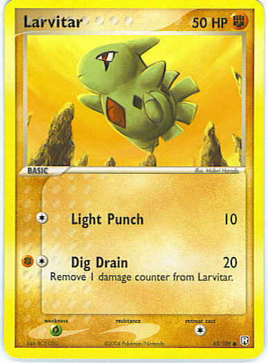 Type | Fighting | Pokemon serie | Team Rocket Returns | Stadie | Basic | HP | 50 | Sjældenhed | Common | Tilbagetrækning | 1 | Svaghed | G | Kortnummer | 63 | Evne | [C] Light Punch (10) [CF] Dig Drain (20) Remove 1 damage counter from Larvitar. | Evne2 | [C] Light Punch (10) [CF] Dig Drain (20) Remove 1 damage counter from Larvitar. | Kunstner | Midori Harada |