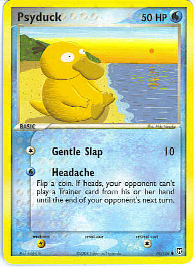 Type | Water | Pokemon serie | Team Rocket Returns | Stadie | Basic | HP | 50 | Sjældenhed | Common | Tilbagetrækning | 1 | Svaghed | L | Kortnummer | 70 | Evne | [C] Gentle Slap (10) [W] Headache - Flip a coin. If heads, your opponent can't play a Trainer card from his or her hand until the end of your opponent's next turn. | Evne2 | [C] Gentle Slap (10) [W] Headache - Flip a coin. If heads, your opponent can't play a Trainer card from his or her hand until the end of your opponent's next turn. | Kunstner | Miki Tanaka |