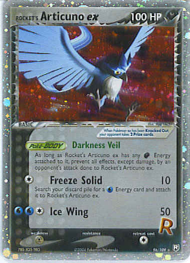 Type | Darkness | Pokemon serie | Team Rocket Returns | Stadie | Basic | HP | 100 | Sjældenhed | Ultra-Rare | Tilbagetrækning | 1 | Svaghed | M | Kortnummer | 96 | Evne | , except damage, by an opponent's attack done to Rocket's Articuno ex. (Poke-BODY)
