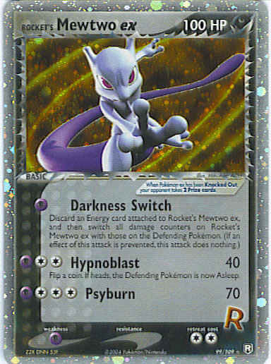 Type | Darkness | Pokemon serie | Team Rocket Returns | Stadie | Basic | HP | 100 | Sjældenhed | Ultra-Rare | Tilbagetrækning | 2 | Svaghed | P | Kortnummer | 99 | Evne | [P] Darkness Switch - Discard an Energy card attached to Rocket's Mewtwo ex, and then switch all damage counters on Rocket's Mewtwo ex with those on the Defending Pokemon. (If an effect of this attack is prevents, this attack does nothing.) [CCP] Hypnoblast (40) Flip a coin. If heads, the Defending Pokemon is now Asleep. [CCCP] Psyburn (70) | Evne2 | [P] Darkness Switch - Discard an Energy card attached to Rocket's Mewtwo ex, and then switch all damage counters on Rocket's Mewtwo ex with those on the Defending Pokemon. (If an effect of this attack is prevents, this attack does nothing.) [CCP] Hypnoblast (40) Flip a coin. If heads, the Defending Pokemon is now Asleep. [CCCP] Psyburn (70) | Kunstner | Mitsuhiro Arita |
