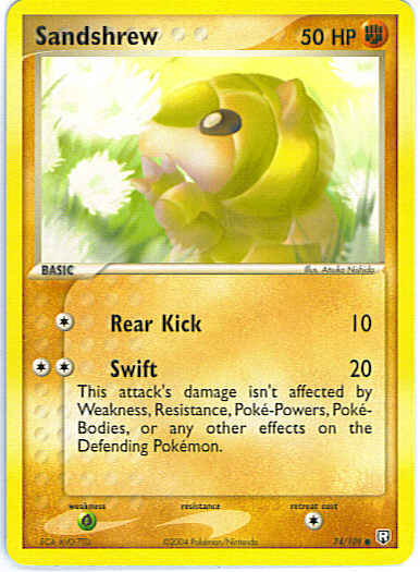 Type | Fighting | Pokemon serie | Team Rocket Returns | Stadie | Basic | HP | 50 | Sjældenhed | Common | Tilbagetrækning | 1 | Svaghed | G | Kortnummer | 74 | Evne | [C] Rear Kick (10) [CC] Swift (20) This attacks damage isn't affected by Weakness, Resistance, Poke-Powers, Poke-Bodies or any other effects on the Defending Pokemon. | Evne2 | [C] Rear Kick (10) [CC] Swift (20) This attacks damage isn't affected by Weakness, Resistance, Poke-Powers, Poke-Bodies or any other effects on the Defending Pokemon. | Kunstner | Atsuko Nishida |