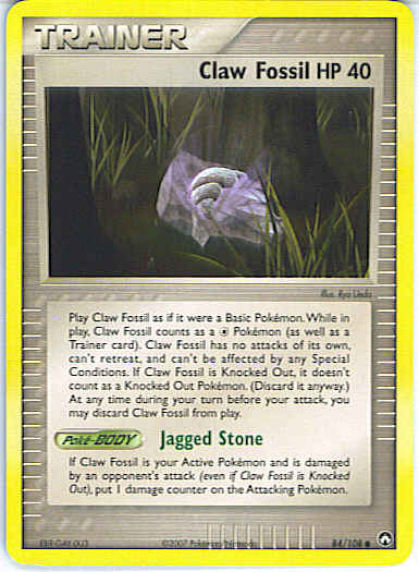 Play Claw Fossil as if it were a Basic Pokemon. While in play, Claw Fossil counts as a C Pokemon (as well as a Trainer card). Claw Fossil has no attacks of its own, can't retreat, and can't be affected by any Special Conditions. If Claw Fossil is Knocked Out, it doesn't count as a Knocked Out Pokemon. (Discard it anyway.) At any time during your turn before your attack, you may discard Claw Fossil from play.