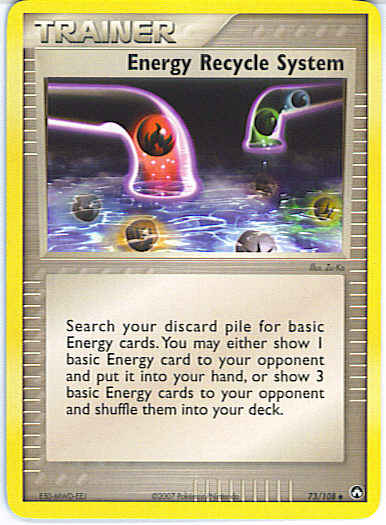 Search your discard pile for basic Energy cards. You may either show 1 basic Energy card to your opponent and put it into your hand, or show 3 basic Energy cards to your opponent and shuffle them into your deck.