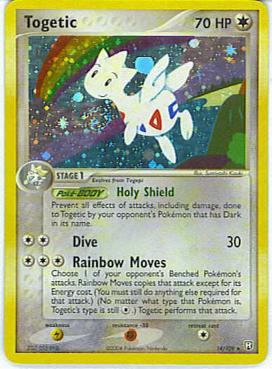 Type | Colorless | Pokemon serie | Team Rocket Returns | Stadie | Stage 1 | HP | 70 | Sjældenhed | Rare | Tilbagetrækning | 1 | Modstand | F | Svaghed | L | Kortnummer | 14 | Evne | of attacks, including damage, done to Togetic by your opponent's Pokemon that has Dark in its name. (Poke-BODY)