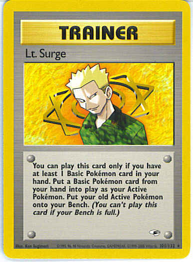You can play this card only if you have at least 1 Basic Pokemon card in your hand. Put a Basic Pokemon card from your hand into play as your Active Pokemon. Put your old Active Pokemon onto your Bench. (You can't play this card if your Bench is full.)