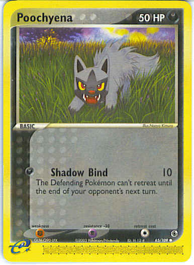 Type | Darkness | Pokemon serie | Ruby Sapphire | Stadie | Basic | HP | 50 | Sjældenhed | Common | Tilbagetrækning | 1 | Modstand | P | Svaghed | F | Kortnummer | 65 | Evne | [D] Shadow Bind (10) The Defending Pokemon can't retreat until the end of your opponent's next turn.