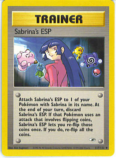 Evne2 Attach Sabrina's ESP to 1 of your Pokemon with Sabrina in its name. At the end of your turn, discard Sabrina's ESP. If that Pokemon uses an attack that involves flipping coins, Sabrina's ESP lets you re-flip those coins once. If you do, re-flip all the coins.