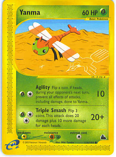| Evne2 | [CG] Agility (10) Flip a coin. If heads, during your opponent's next turn prevent all effects of attacks, including damage, done to Yanma. [CCG] Triple Smash (20+) Flip 3 coins. This attack does 20 damage plus 10 more damage for each heads.