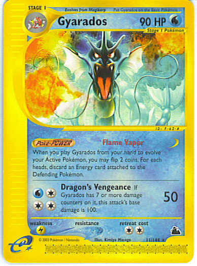 Type | Water | Pokemon serie | Skyridge | Stadie | Stage 1 | HP | 90 | Sjældenhed | Rare | Tilbagetrækning | 2 | Svaghed | L | Kortnummer | 11 | Evne | [CCCW] Dragon's Vengeance (50) If Gyarados has 7 or more damage counters on it, this attack's base damage is 100.