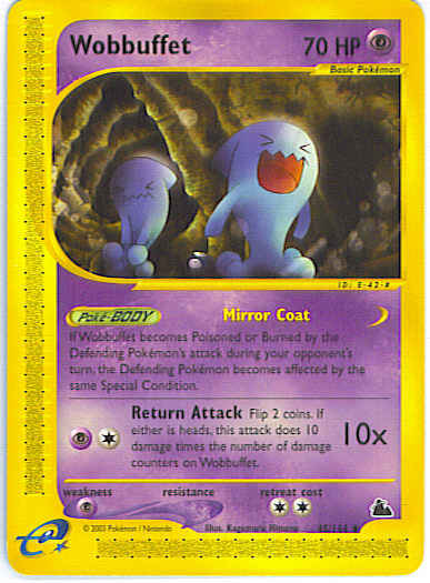 Type | Psychic | Pokemon serie | Skyridge | Stadie | Basic | HP | 70 | Sjældenhed | Uncommon | Tilbagetrækning | 2 | Svaghed | P | Kortnummer | 45 | Evne | [CP] Return Attack (10x) Flip 2 coins. If either is heads, this attack does 10 damage times the number of damage counters on Wobbuffet.