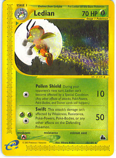 Type | Grass | Pokemon serie | Skyridge | Stadie | Stage 1 | HP | 70 | Sjældenhed | Rare | Svaghed | R | Kortnummer | 15 | Evne | [C] Pollen Shield (10) During your opponent's next turn, Ledian can't become affected by a Special Condition. (Any other effect of attacks, Poke-Powers, Poke-Bodies, and Trainer cards still happen.) [CGG] Swift (50) This attack's damage isn't affected by Weakness, Resistance, Poke-Powers, Poke-Bodies, or any other effects on the Defending Pokemon.