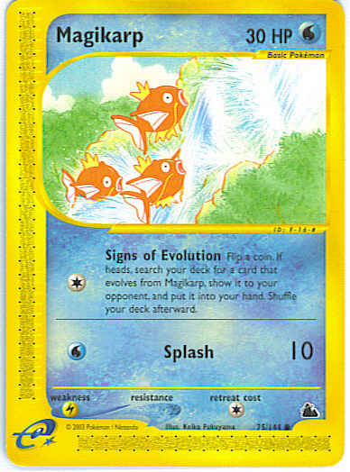 Type | Water | Pokemon serie | Skyridge | Stadie | Basic | HP | 30 | Sjældenhed | Common | Tilbagetrækning | 1 | Svaghed | L | Kortnummer | 75 | Evne | [C] Signs of Evolution - Flip a coin. If heads, search your deck for a card that evolves from Magikarp, show it to your opponent, and put it into your hand. Shuffle your deck afterward. [W] Splash (10)